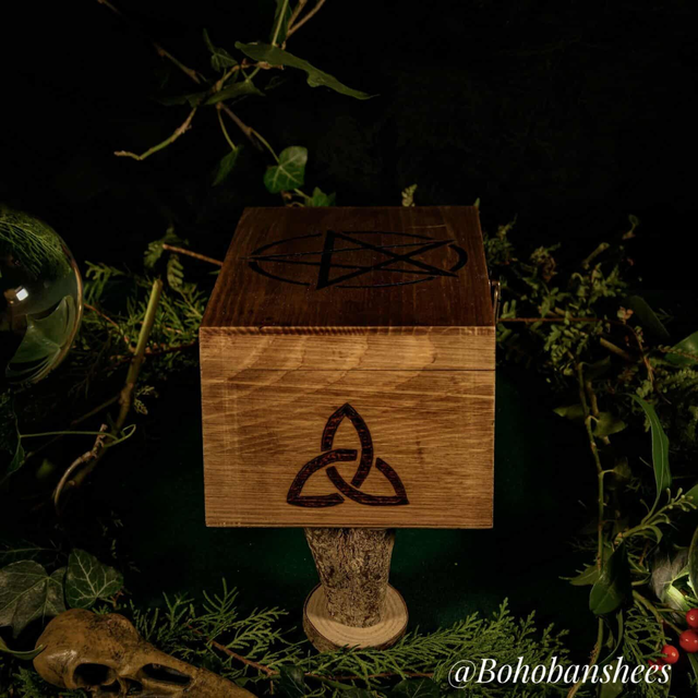 The lid features a powerful Pentagram for protection and balance, the front and back display Celtic Knotwork to represent unity and infinite flow, and each side is finished with a Triskel symbol for movement, growth and spiritual harmony.