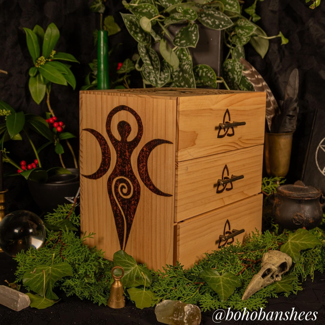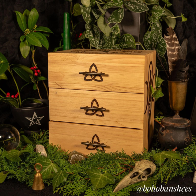 Hand-Burned Wooden Apothecary Drawers – Tree of Life/Goddess