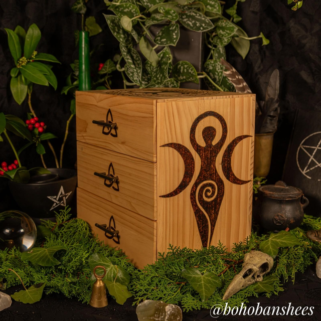 Tree of Life & Goddess – with Celtic Tree of Life on top, Goddess on both sides and a Triskel on each drawer.